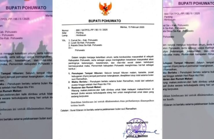 GERAK.ID – Pemerintah Kabupaten Pohuwato bergerak cepat memastikan suasana kondusif menjelang Bulan suci Ramadhan 1447 H/2026 M. Melalui Surat Imbauan Nomor: 800 / SATPOL-PP / 66 / II / 2026, Bupati Pohuwato, Saipul A. Mbuinga, secara resmi mengeluarkan instruksi tegas ...