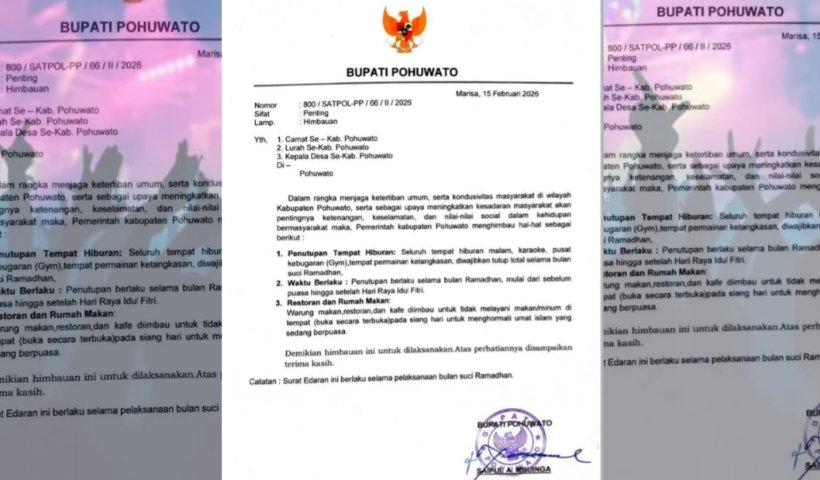 Melalui Surat Imbauan Nomor: 800 / SATPOL-PP / 66 / II / 2026, Bupati Pohuwato, Saipul A. Mbuinga, secara resmi mengeluarkan instruksi tegas terkait pembatasan aktivitas hiburan dan operasional rumah makan di seluruh wilayah kabupaten.