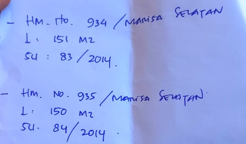 Dokter Irvan menjelaskan, adapun ciri-ciri 2 sertifikat yakni: HM. No. 934/Marisa Selatan dengan Luas: 151 M2 Su: 83/2014 dan HM. No. 935/Marisa Selatan dengan Luas: 150 M2 Su: 84/2014.